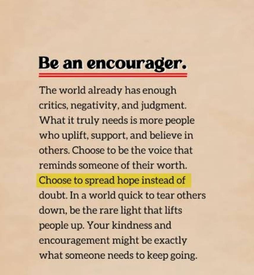 5th October 2025 One of my favourite quotes is : “Be an encourager, there are enough critics already in this world.” Spend a day, a week, a month without finding fault, rather spend it seeing the good in everyone. When you see something beautiful in someone, tell them. It may take you a second to […]