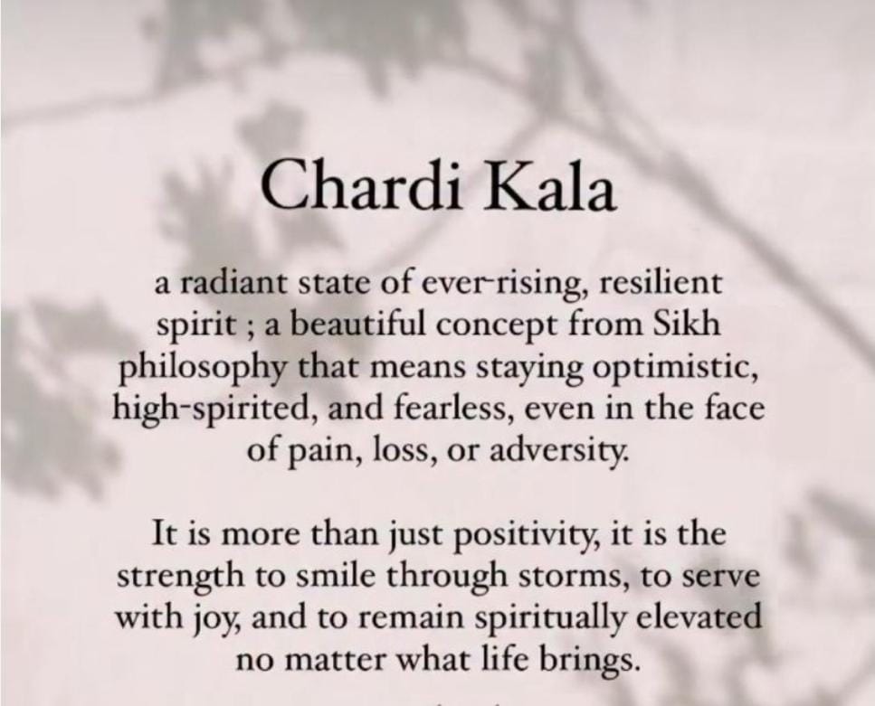 To be in ‘Chardi Kala’ is the ability to rise above adversity, challenges and difficult times. It is to accept whatever is going on in our lives with gratitude and with a neutral mind.