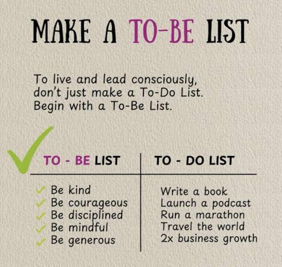 She just said, “We make To-Do lists, and yet has anyone ever created a To-Be list? We are human beings – not human doings, so why do we forget that Being is as important as Doing?”